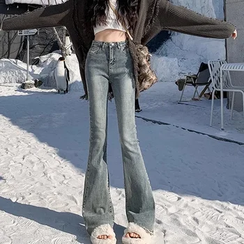 2024 Woman High Waist Vintage Flare Jeans Female Gothic Elastic Bell Bottom Pants Lady Streetwear Blue Black Grey Denim Trousers