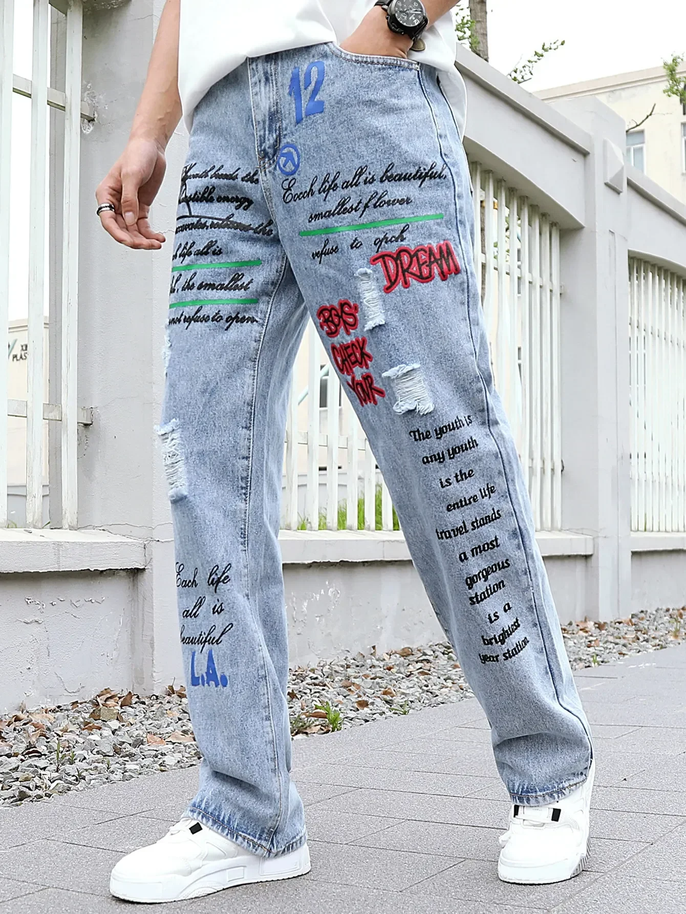 Men’s y2k Baggy Jeans Hip Hop Ripped Trousers Harem Cartoon Loose Graffiti Printing Denim Casual Pants Cargo Jeans for Men