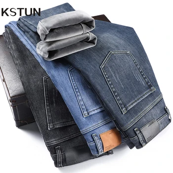KSTUN 2025 Winter Jeans For Men Fleece Warmer Jeans Straight Stretch Business Casual Men’s Trousers Denim Pants Thick Streetwear