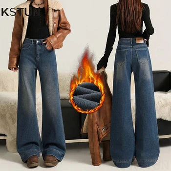 Bell-Bottom Jeans Women High Waist Warm Thicken Jeans With Fleece Womens Winter Wide Leg Flared Pants Comfortable Vintage Pants